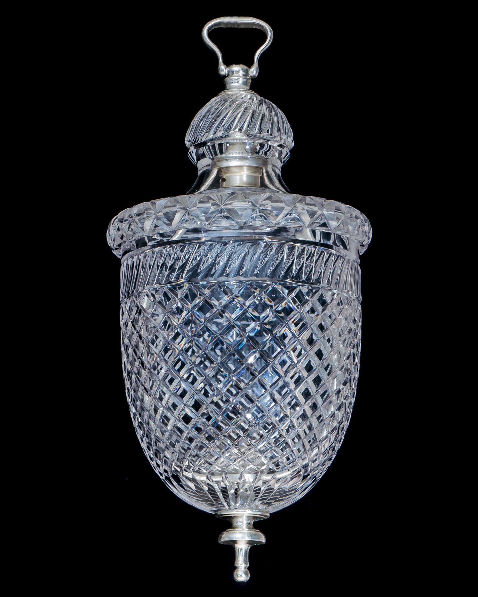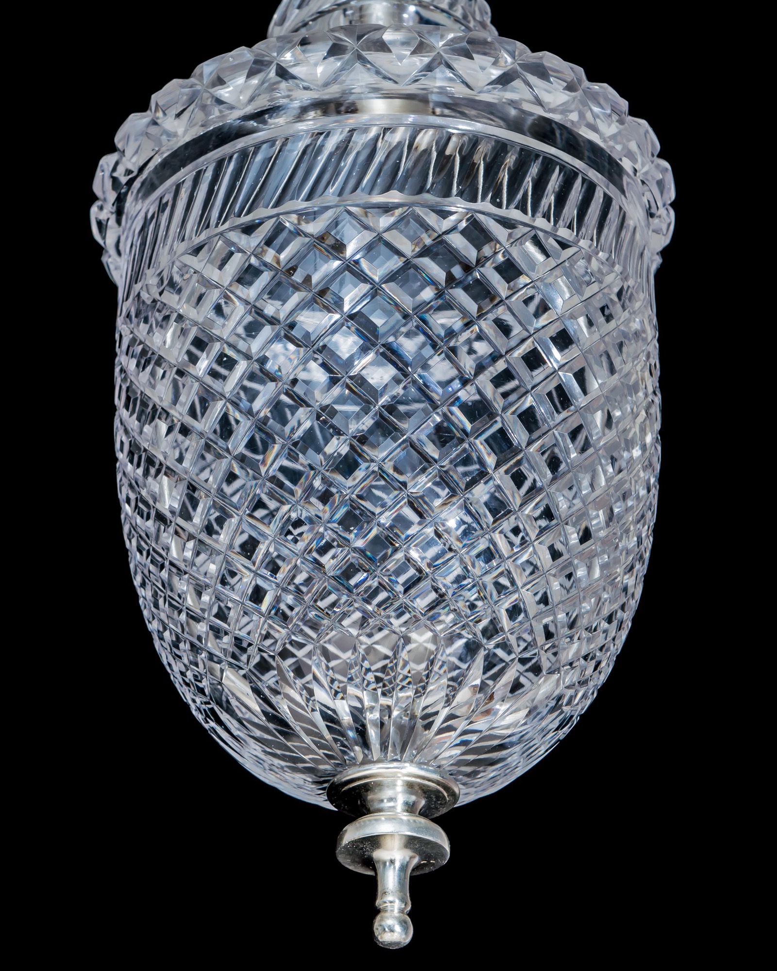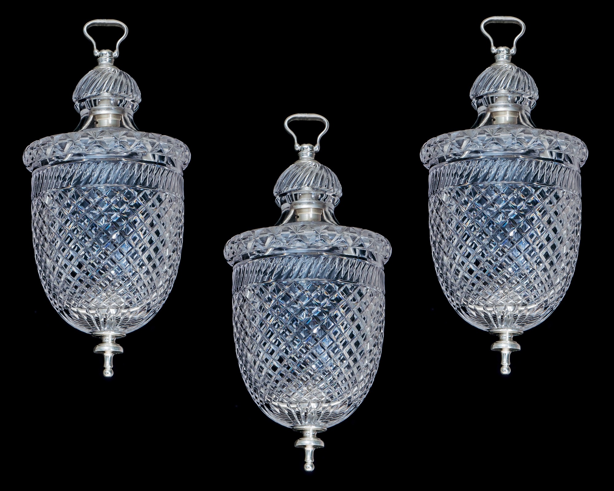 A superb set of three Victorian cut glass hall lanterns, each beautifully crafted with silvered mounts and richly detailed crystal bodies. The elegant ovoid forms are finely hand-cut with raised, flat diamonds and fluted patterns, designed to shimmer with reflected light. Each lantern is surmounted by a domed lid adorned with diamond and gadrooned decoration, and terminates in a delicate silvered finial.