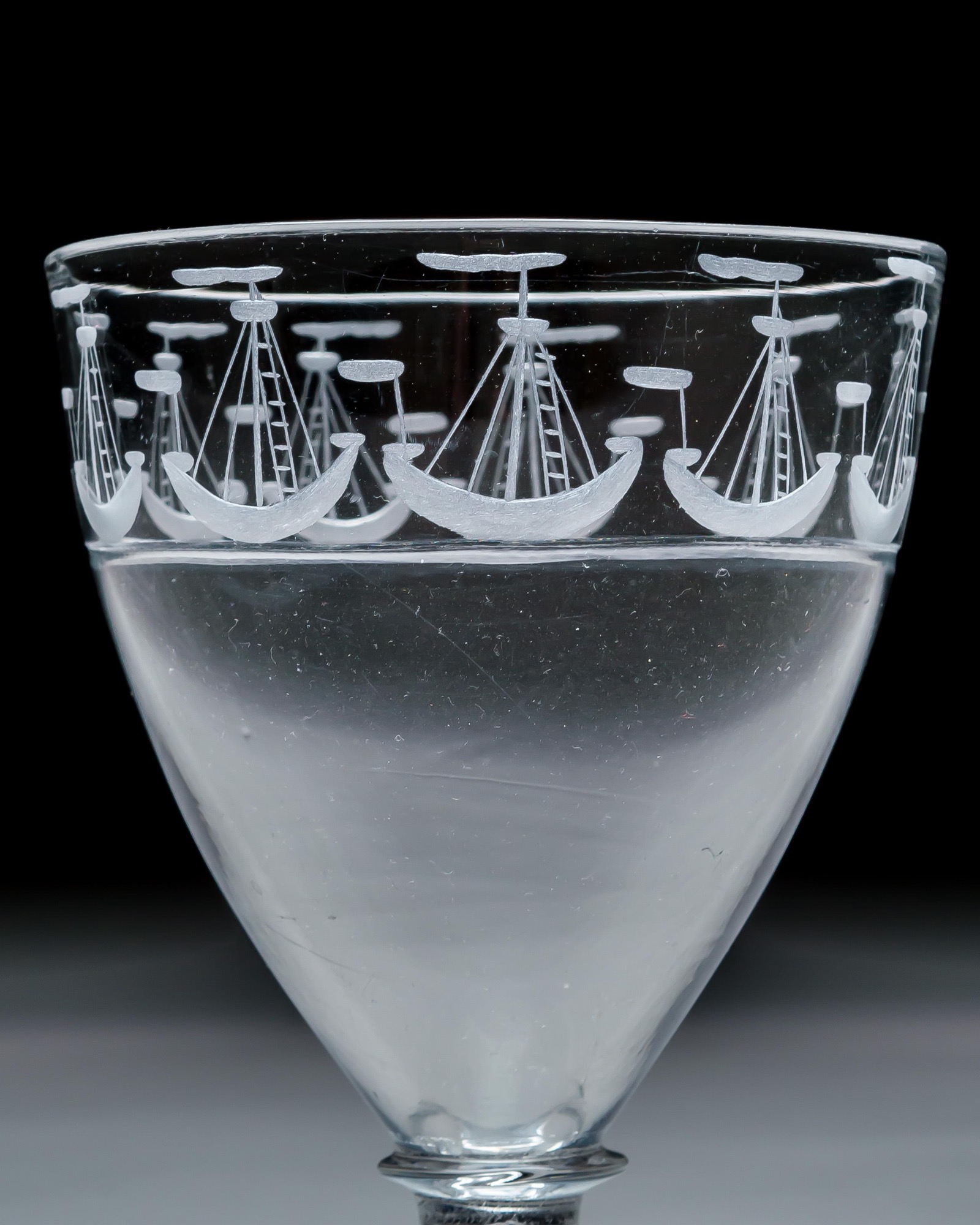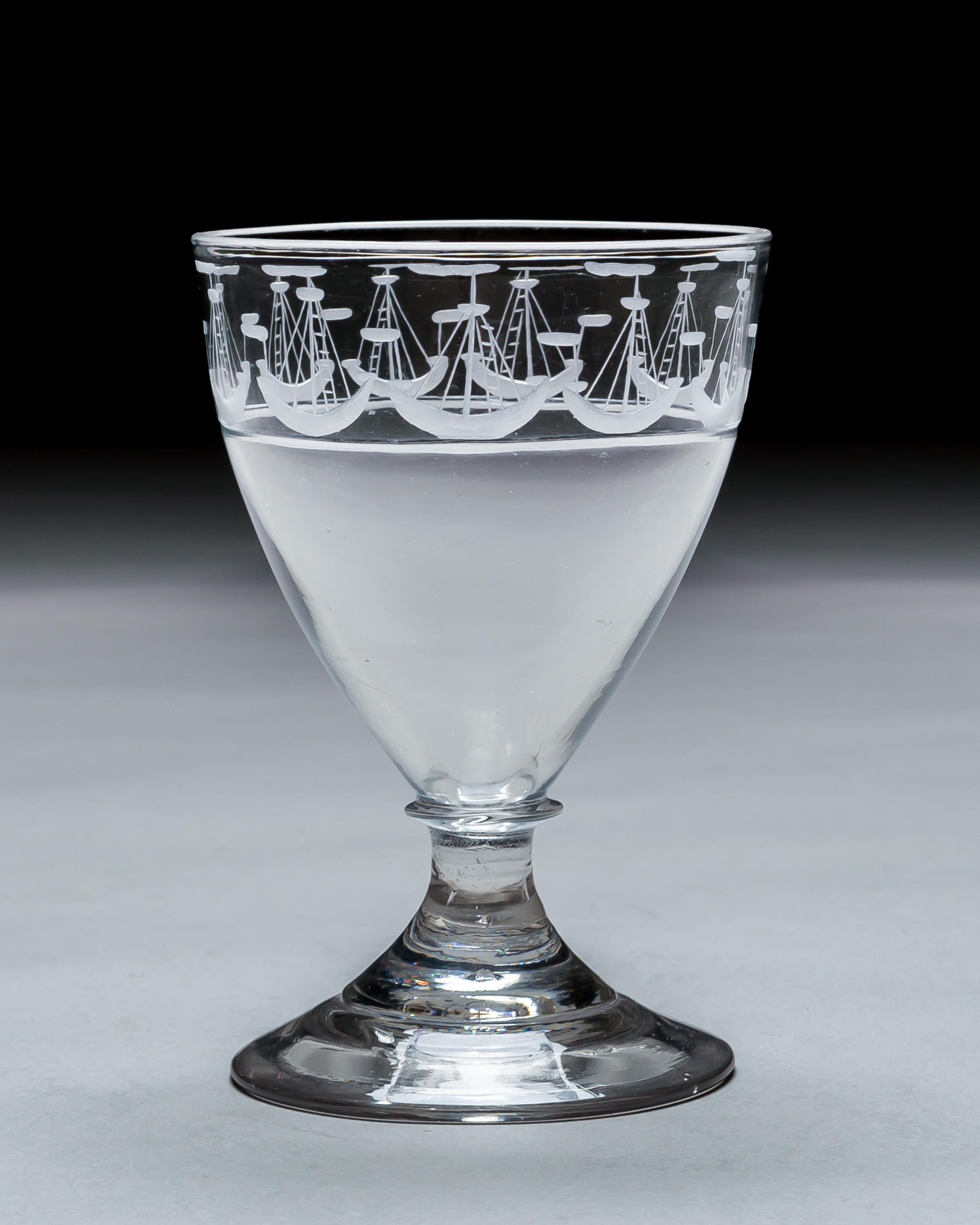A charming rummer glass beautifully engraved with a continuous frieze of stylised sailing ships in full rig, linked by a delicate wave motif. The crisp engraving captures the maritime spirit of the late 18th and early 19th centuries, a period when sea trade and exploration were central to British identity.