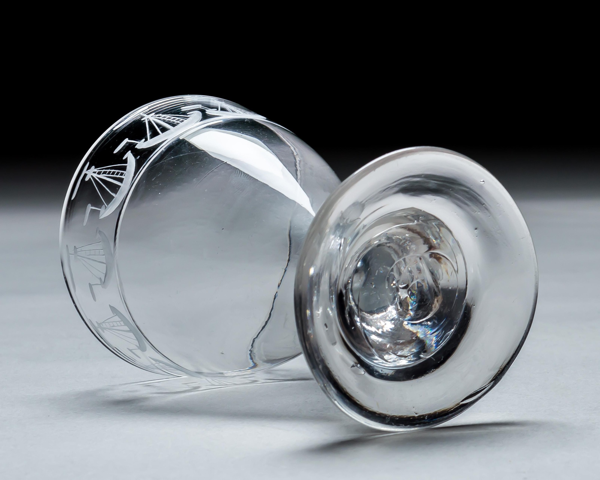Rummers such as this were often used for toasting prosperity, safe voyages, and naval victories, making this piece both decorative and historically evocative. The fine clarity of the glass and the whimsical precision of the engraving lend it a timeless nautical elegance.