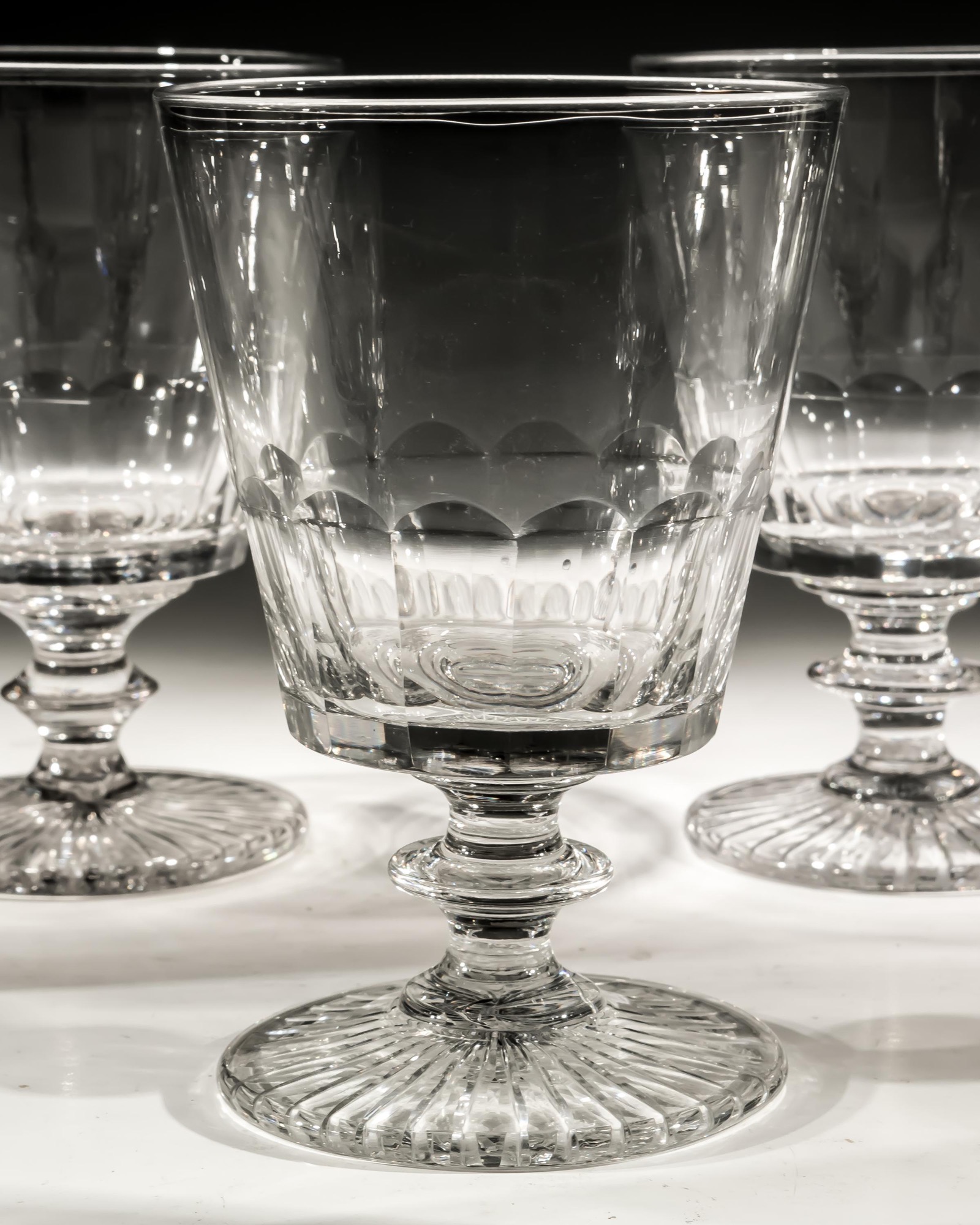 A set of seven slice cut bucket bowl goblets with radial cut foot.