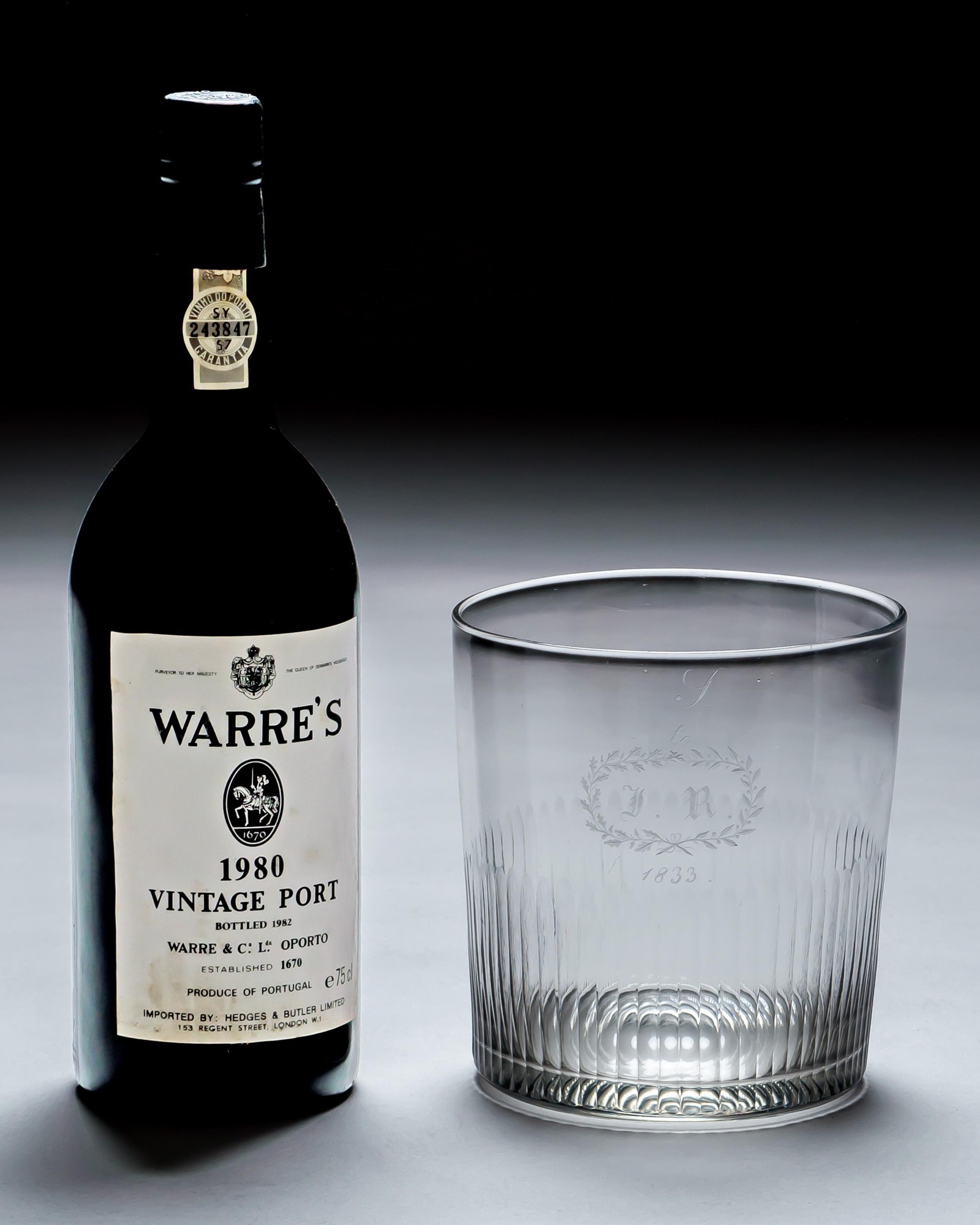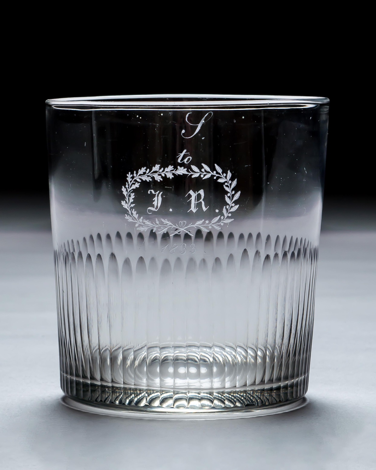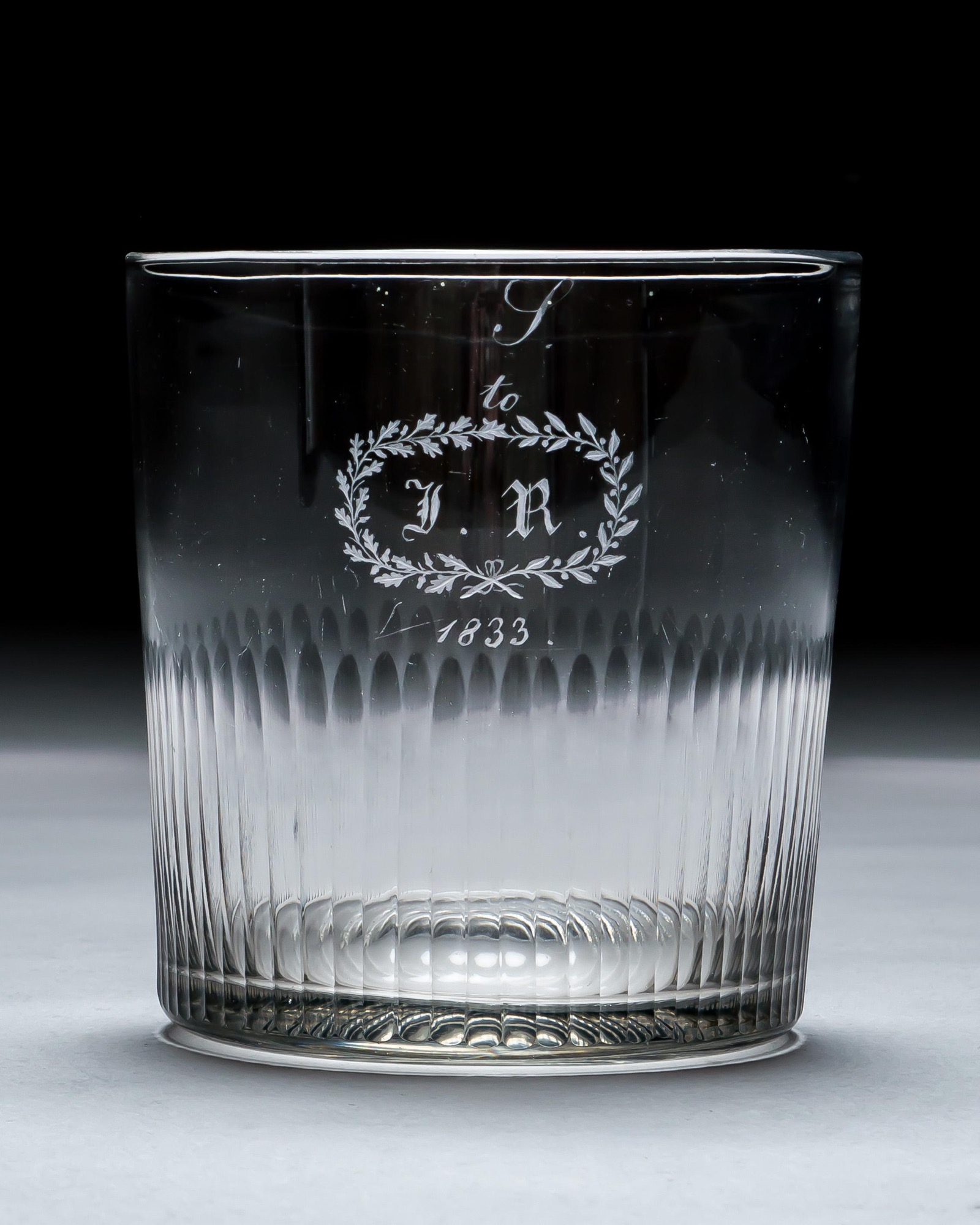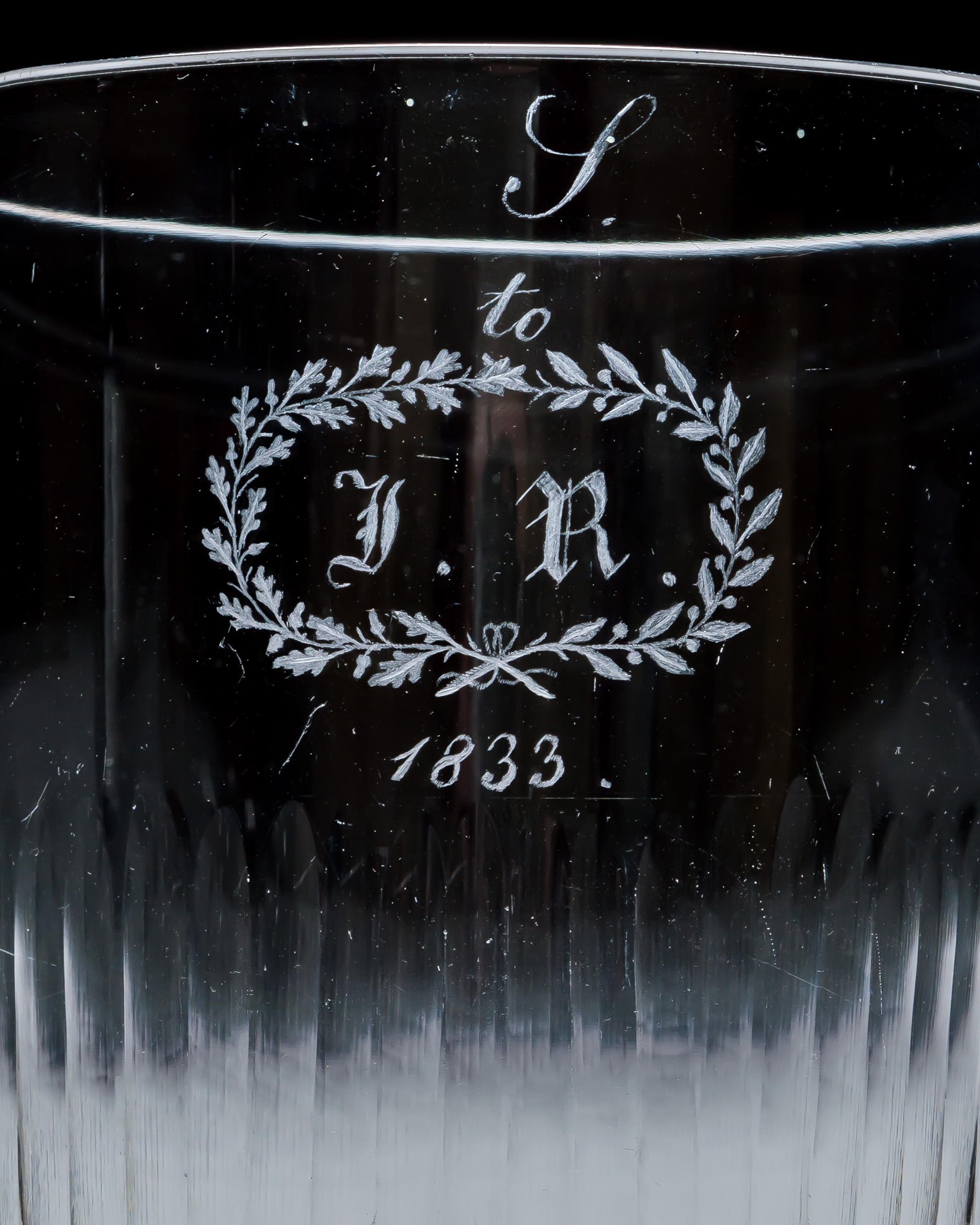 A flute cut tumbler of mammoth proportions finely engraved with the initials J R with leaf boarder.