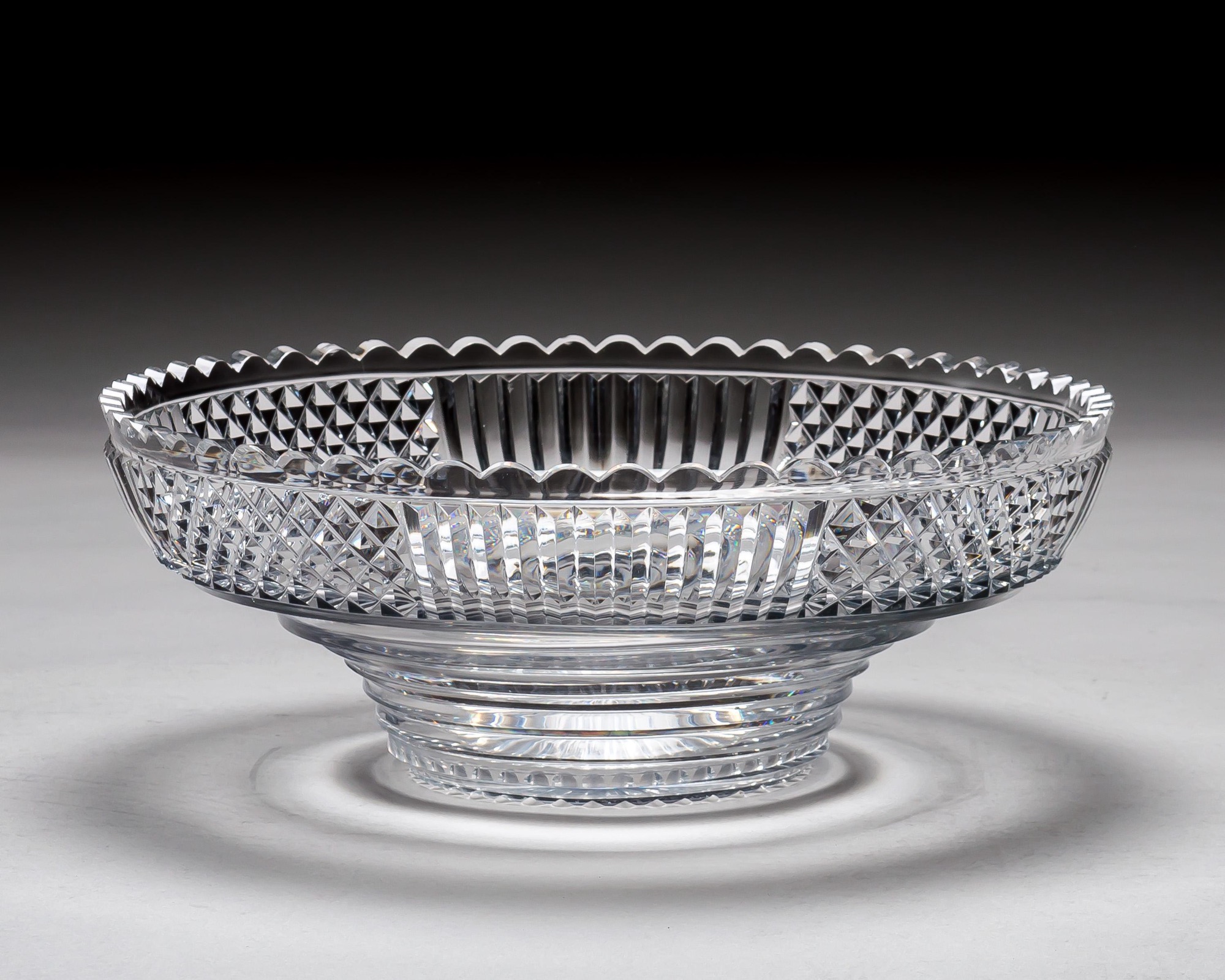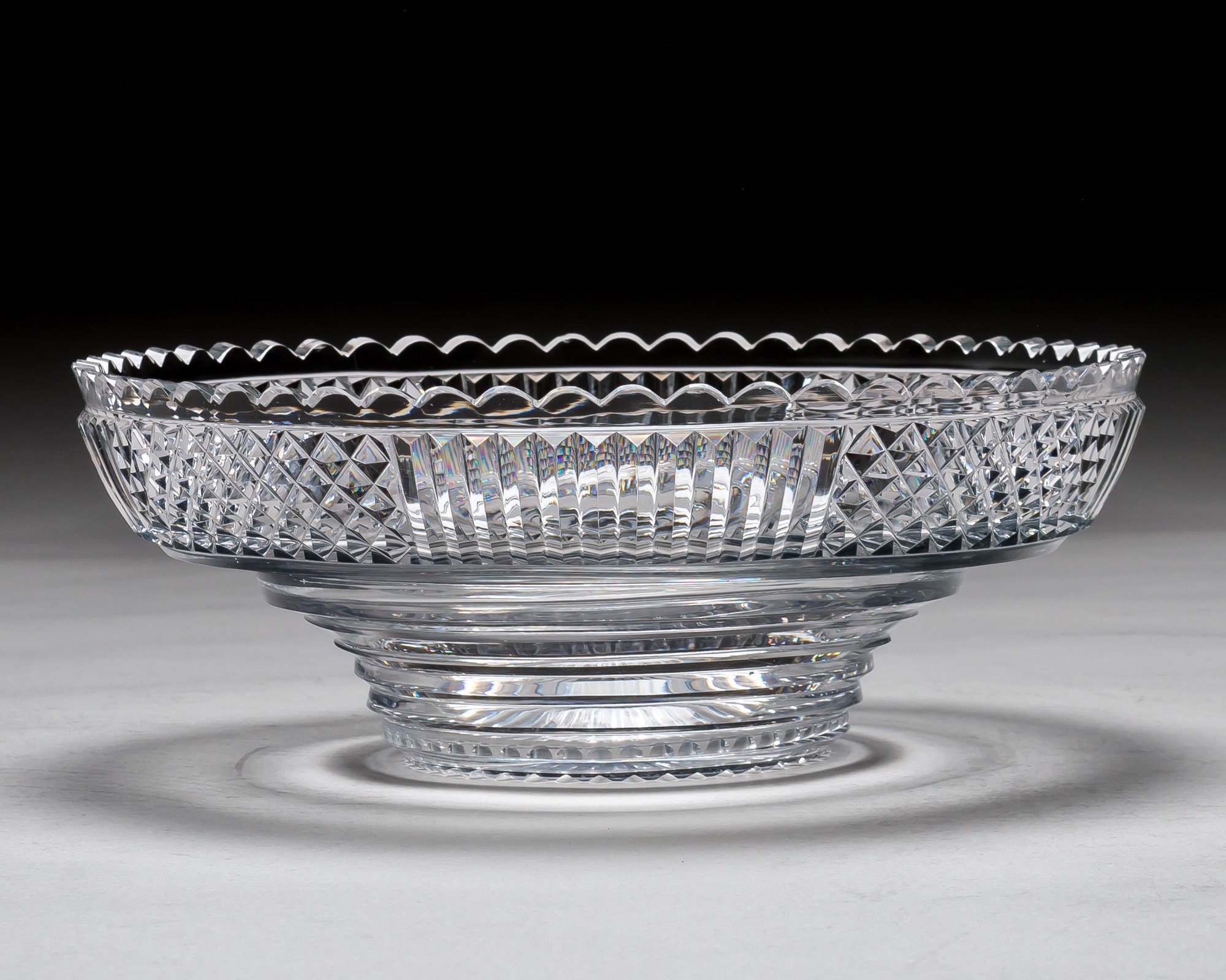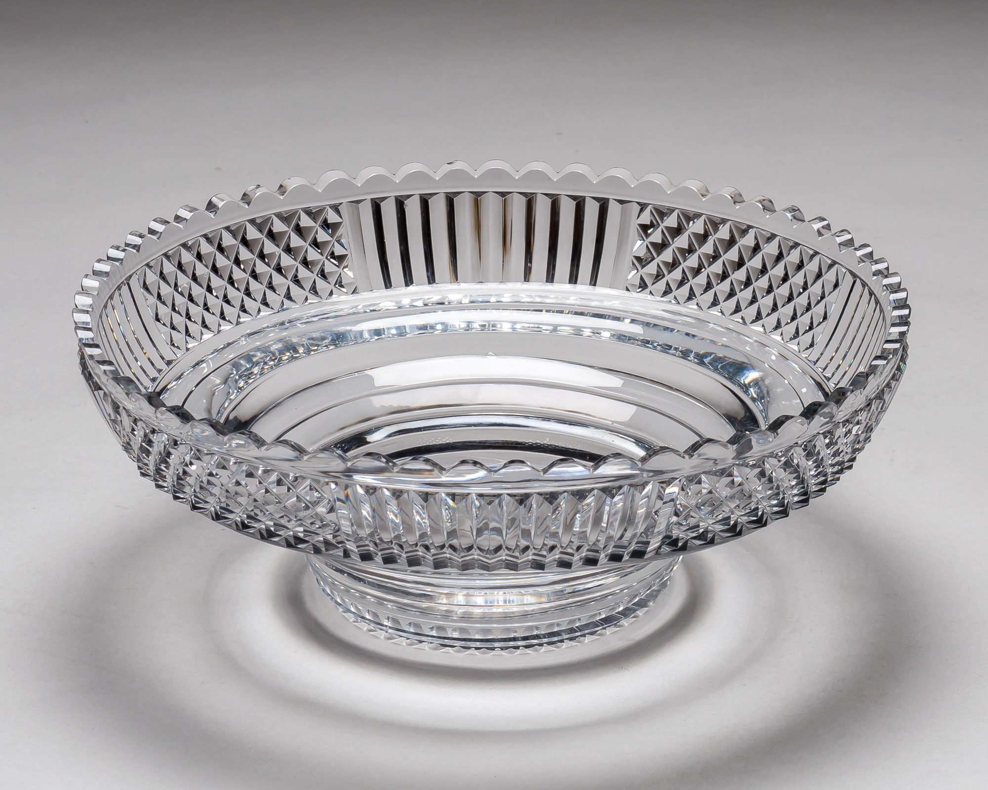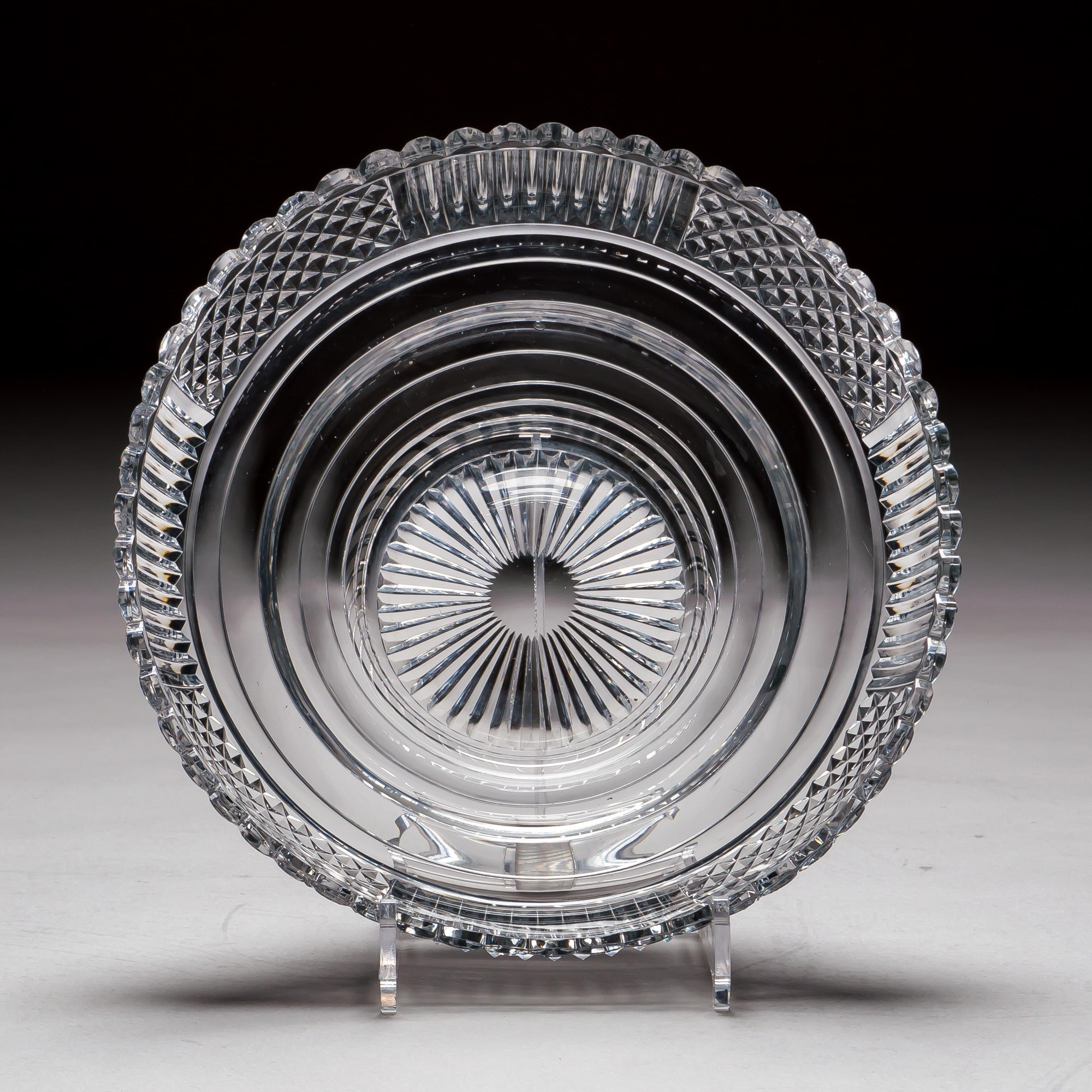 A refined English cut-glass bowl from the Regency period, with a gently scalloped rim and band of diamond and mitre cut panels. The bowl descends into a beautifully proportioned stepped cutting finalised with radial cut base. The glass itself carries the soft weight and exceptional clarity typical of early 19th-century lead crystal.