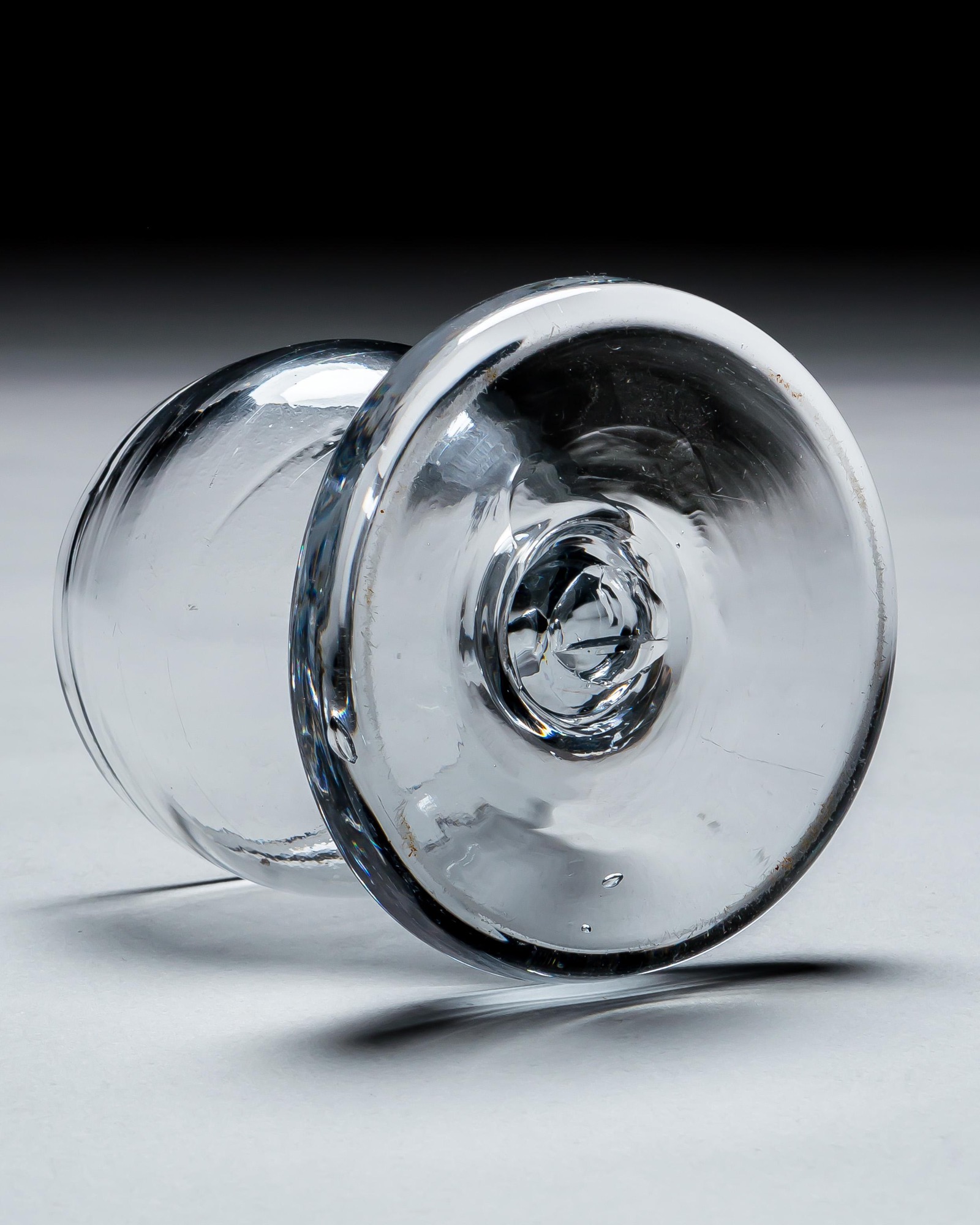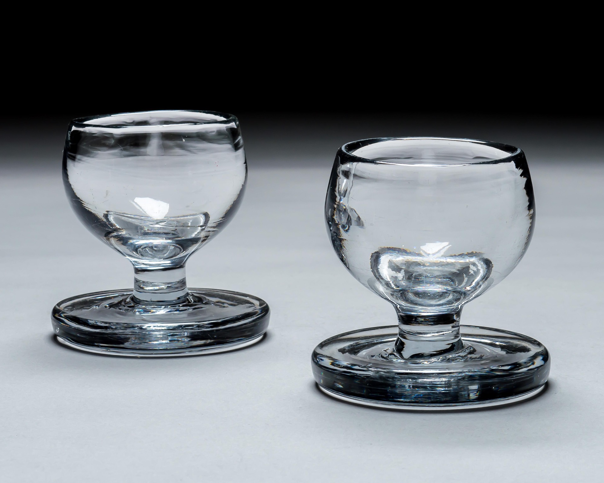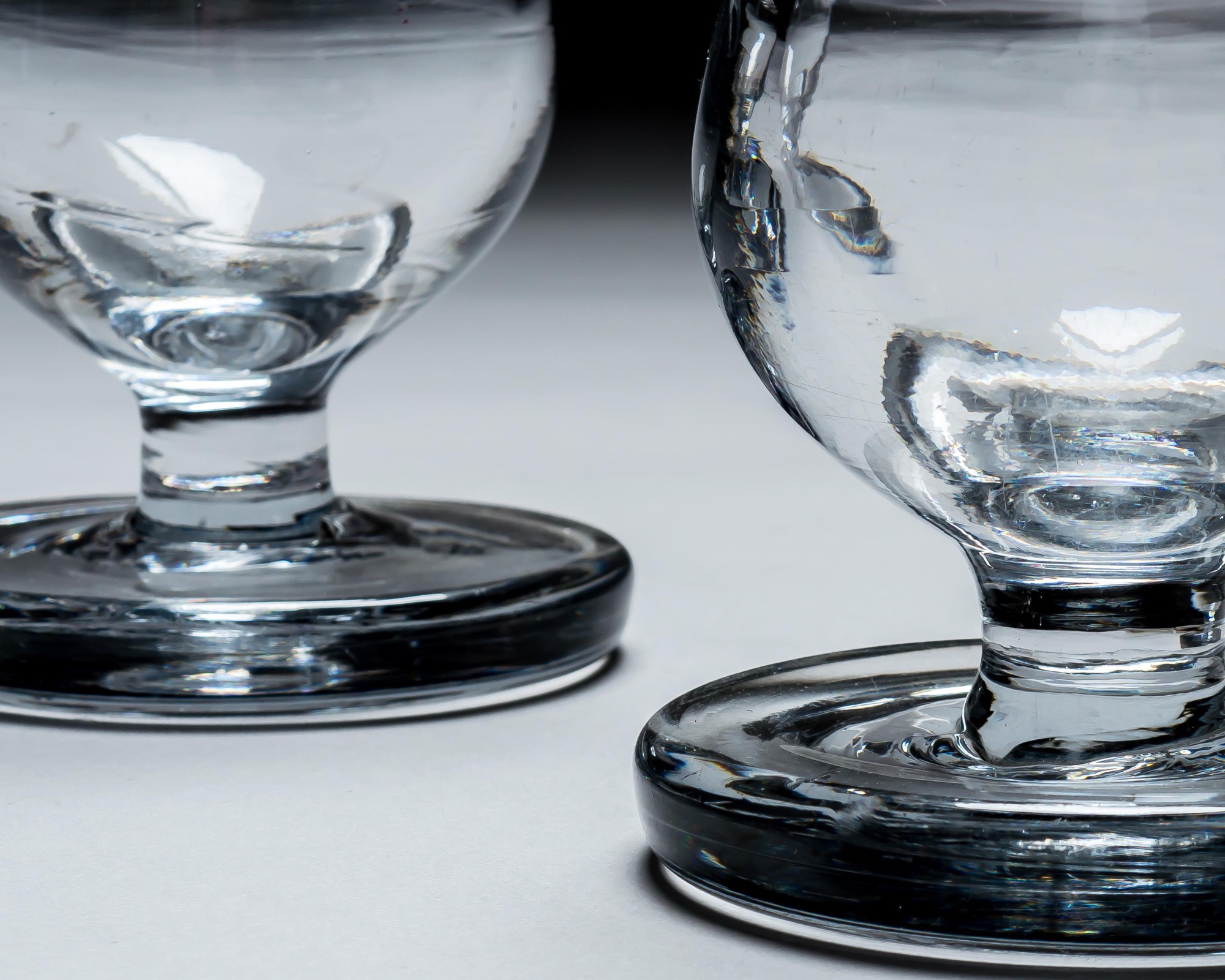 The comports display the charming irregularities typical of hand-blown 18th-century glass, including subtle striations and small air bubbles that testify to their handmade origin. Their bold simplicity and tactile weight make them both historically fascinating and visually striking examples of early English glassware.