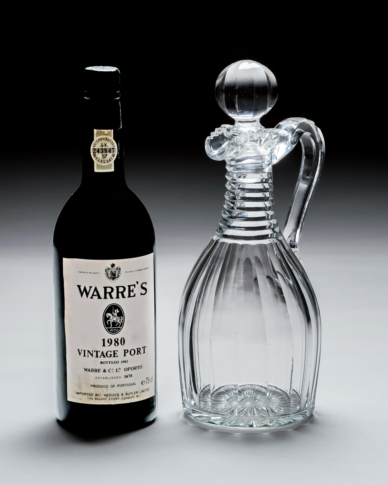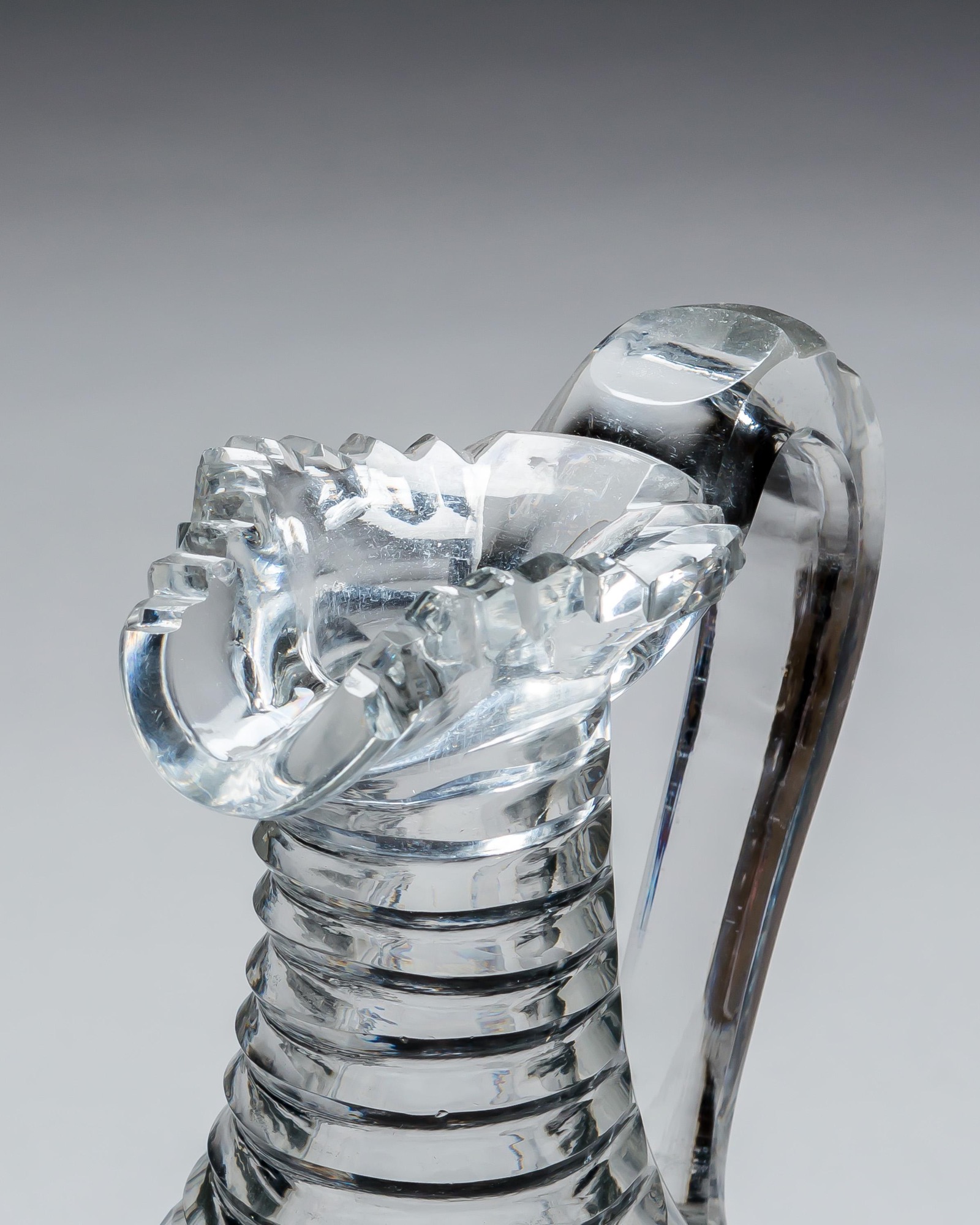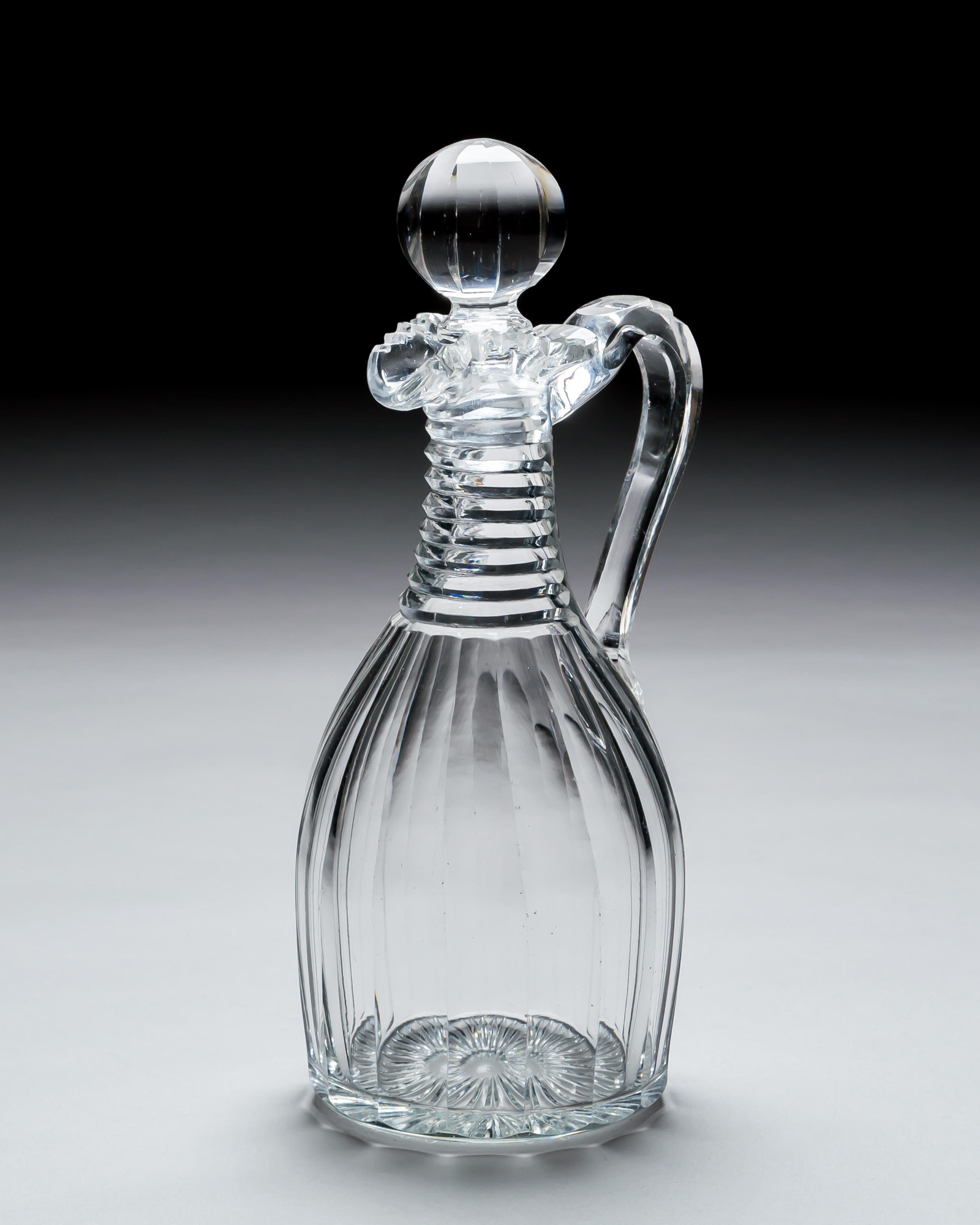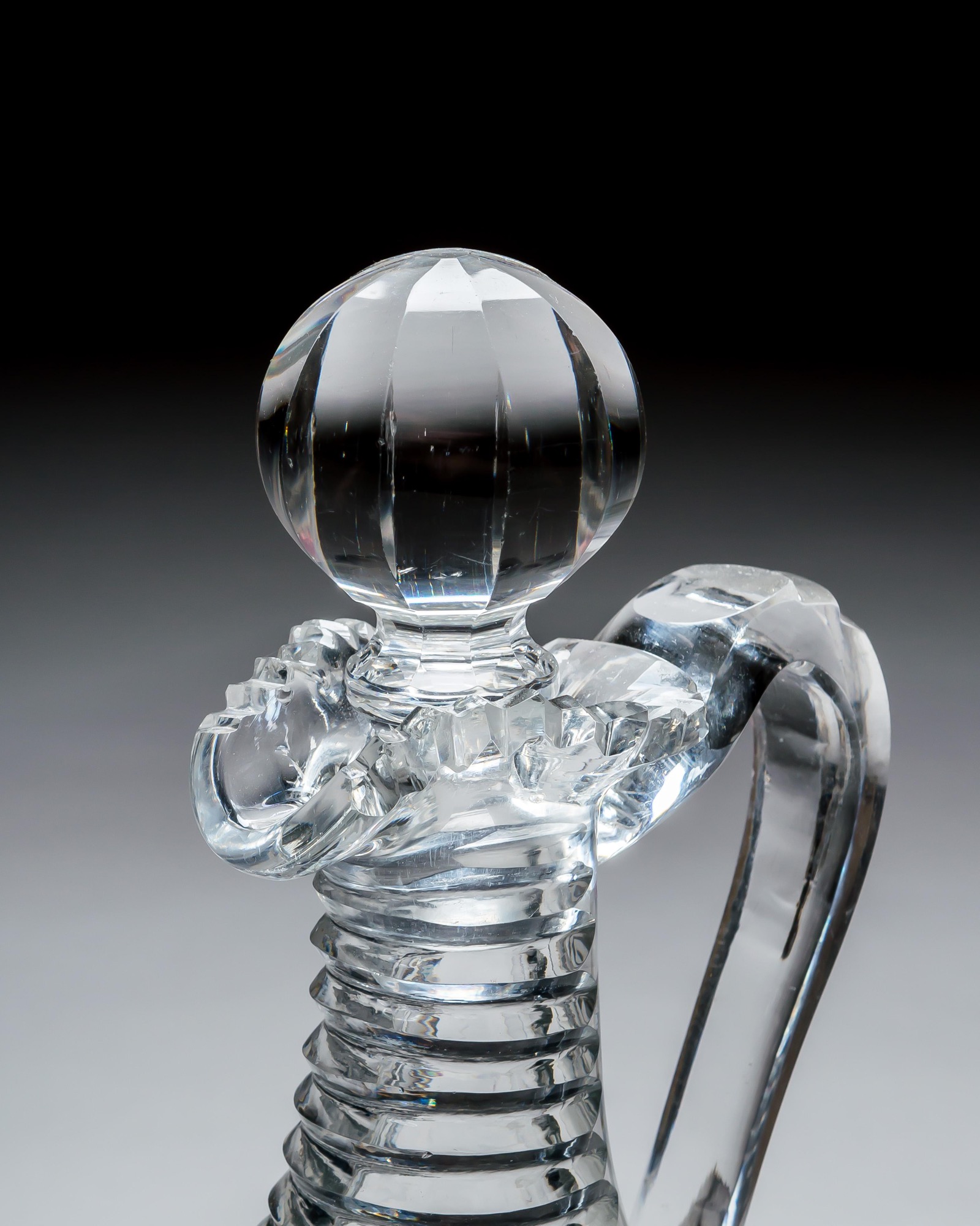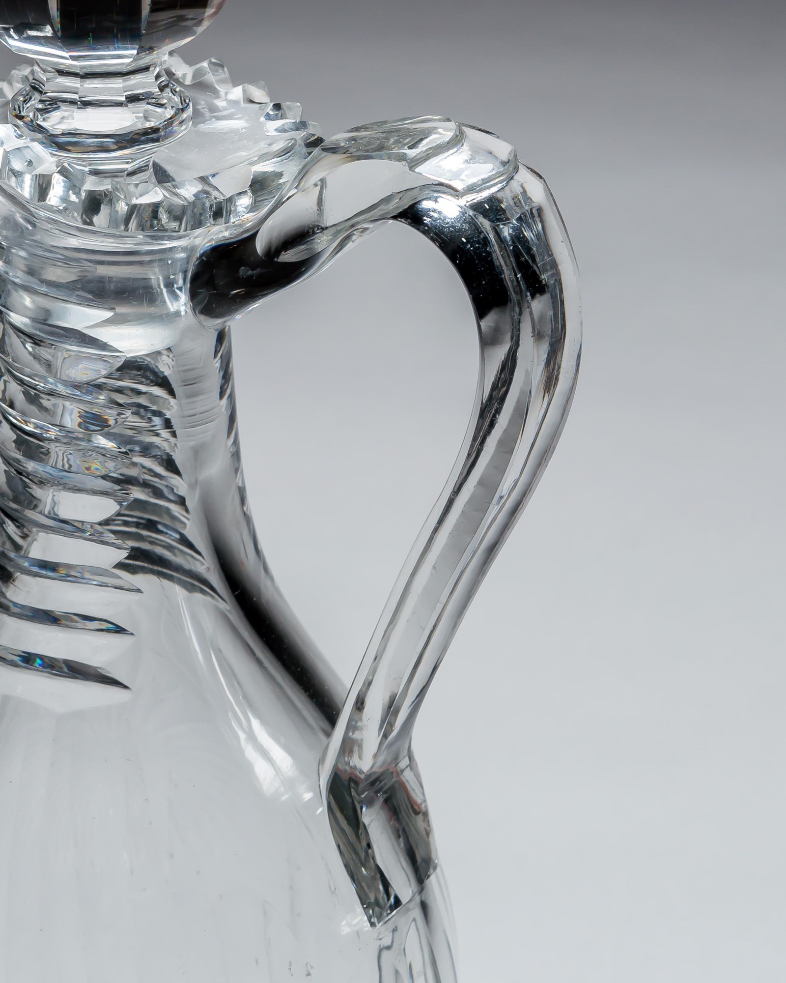 A cut glass claret jug of elegant tapering form, exemplifying the refined craftsmanship of early 19th century glassmaking. The body is decorated with broad slice cut panels that rise gracefully from a radial base. The neck features a series of horizontal step cuts, adding both texture and visual balance, while the elegantly shaped handle is applied with precision and poise. The jug is topped with a polished spherical stopper, its slice cuts echoing the rhythm of the body below.