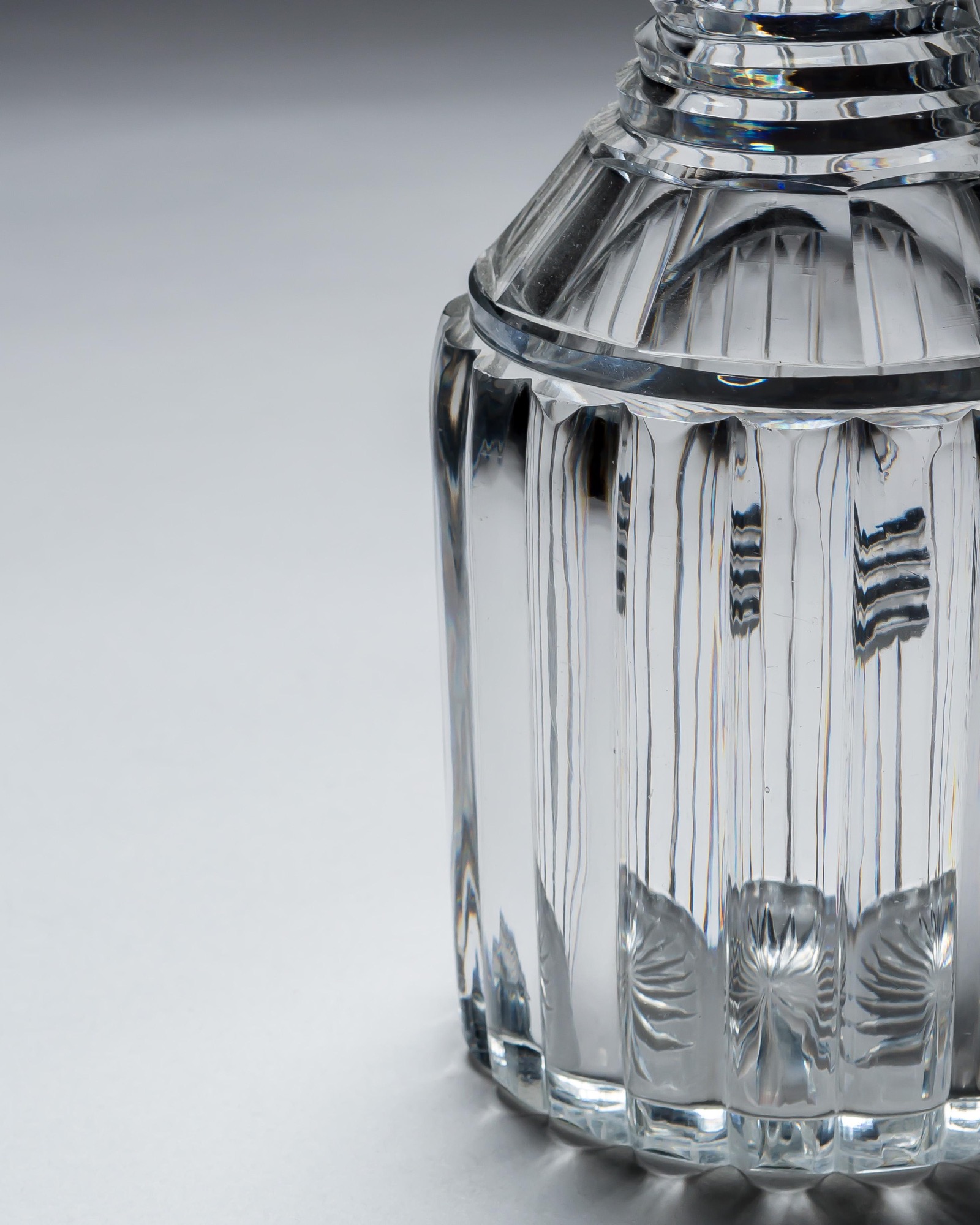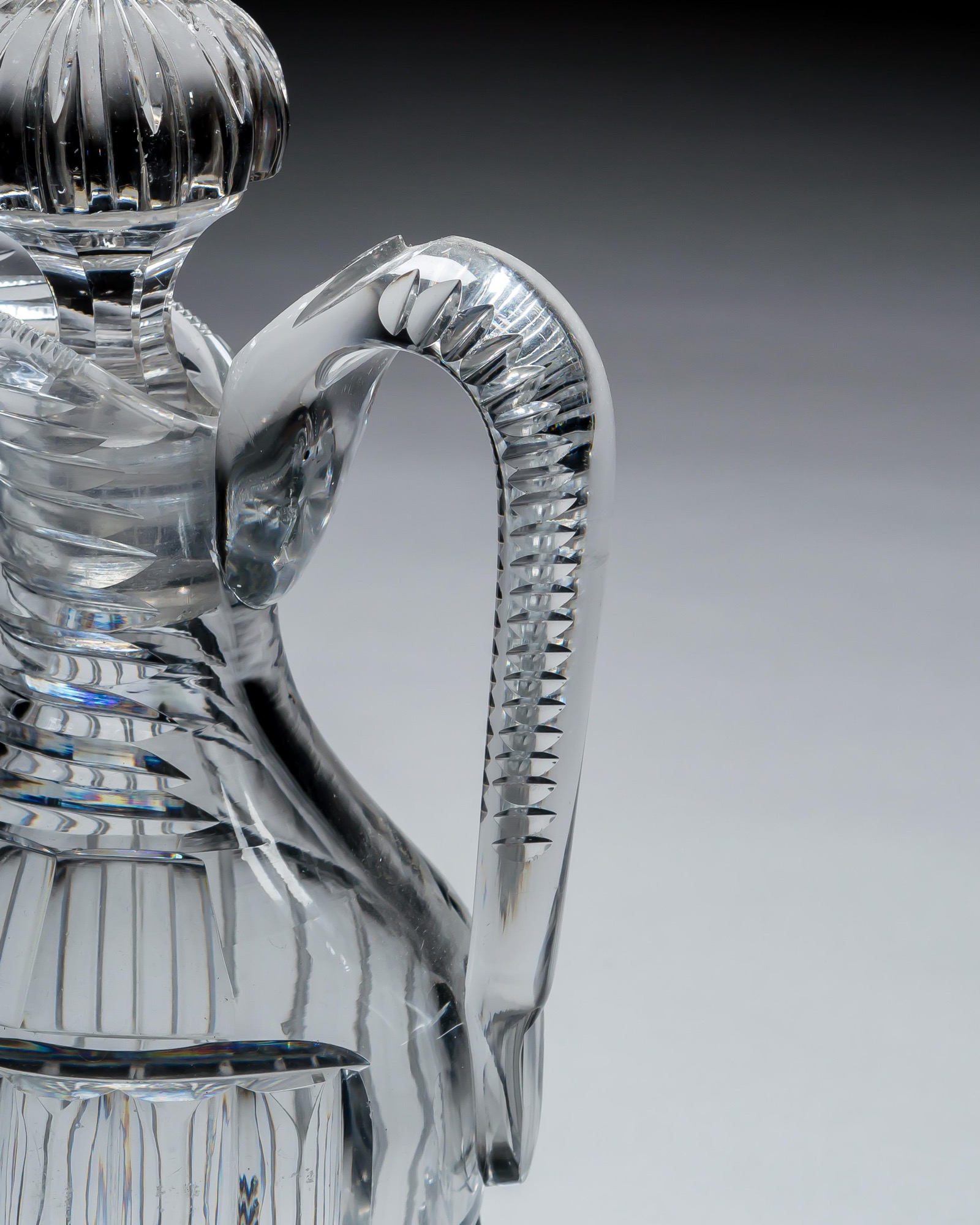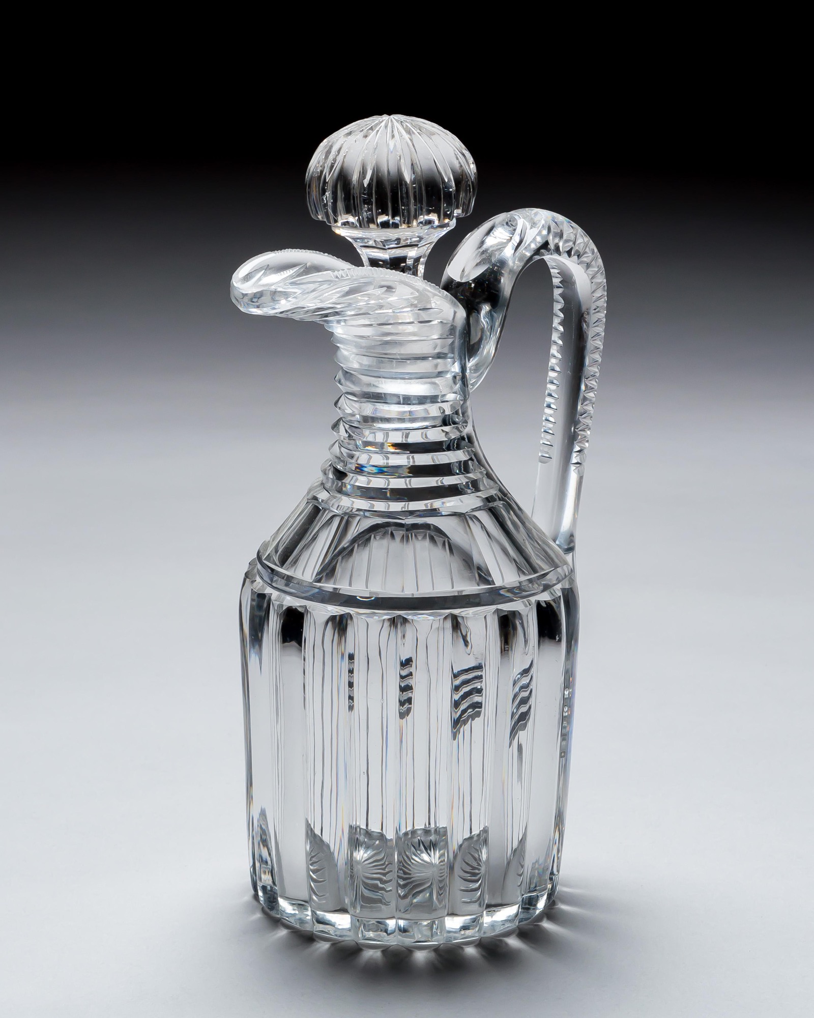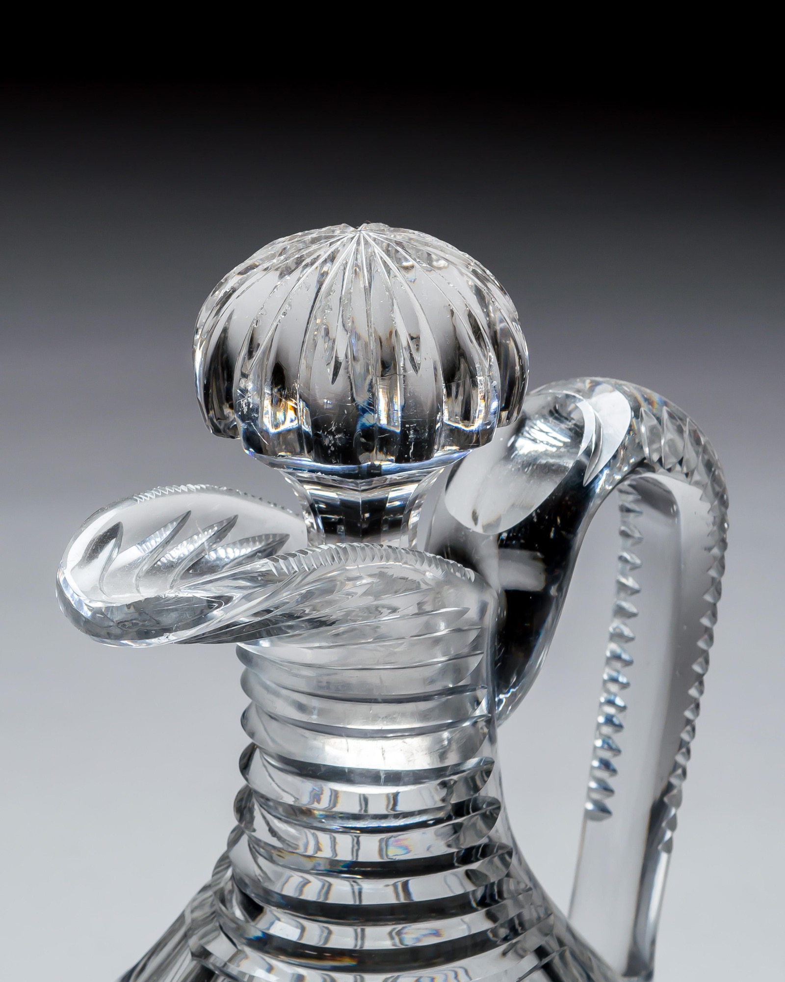 A Regency pillar cut claret jug with corresponding stopper, step cut neck and notch cut handle.