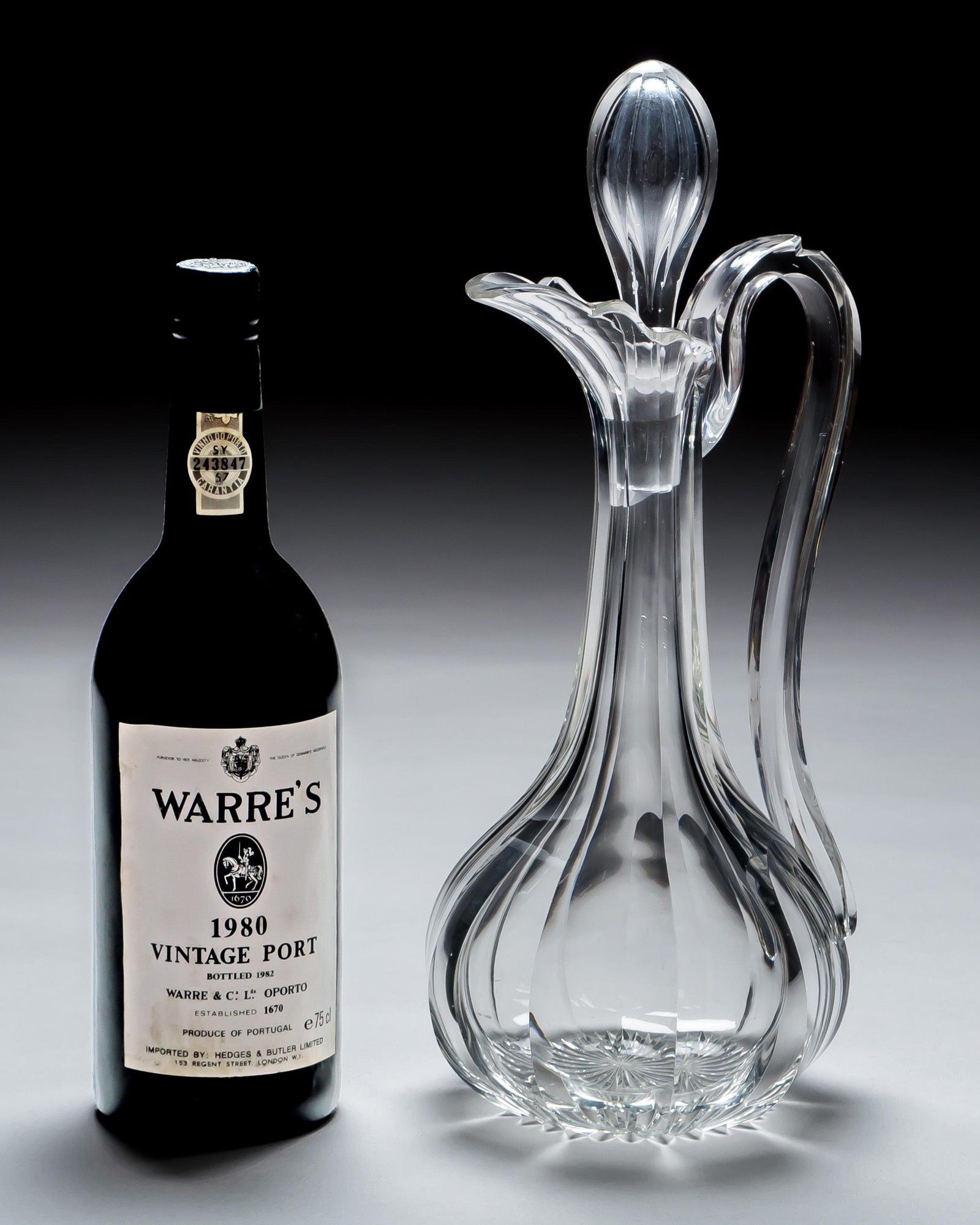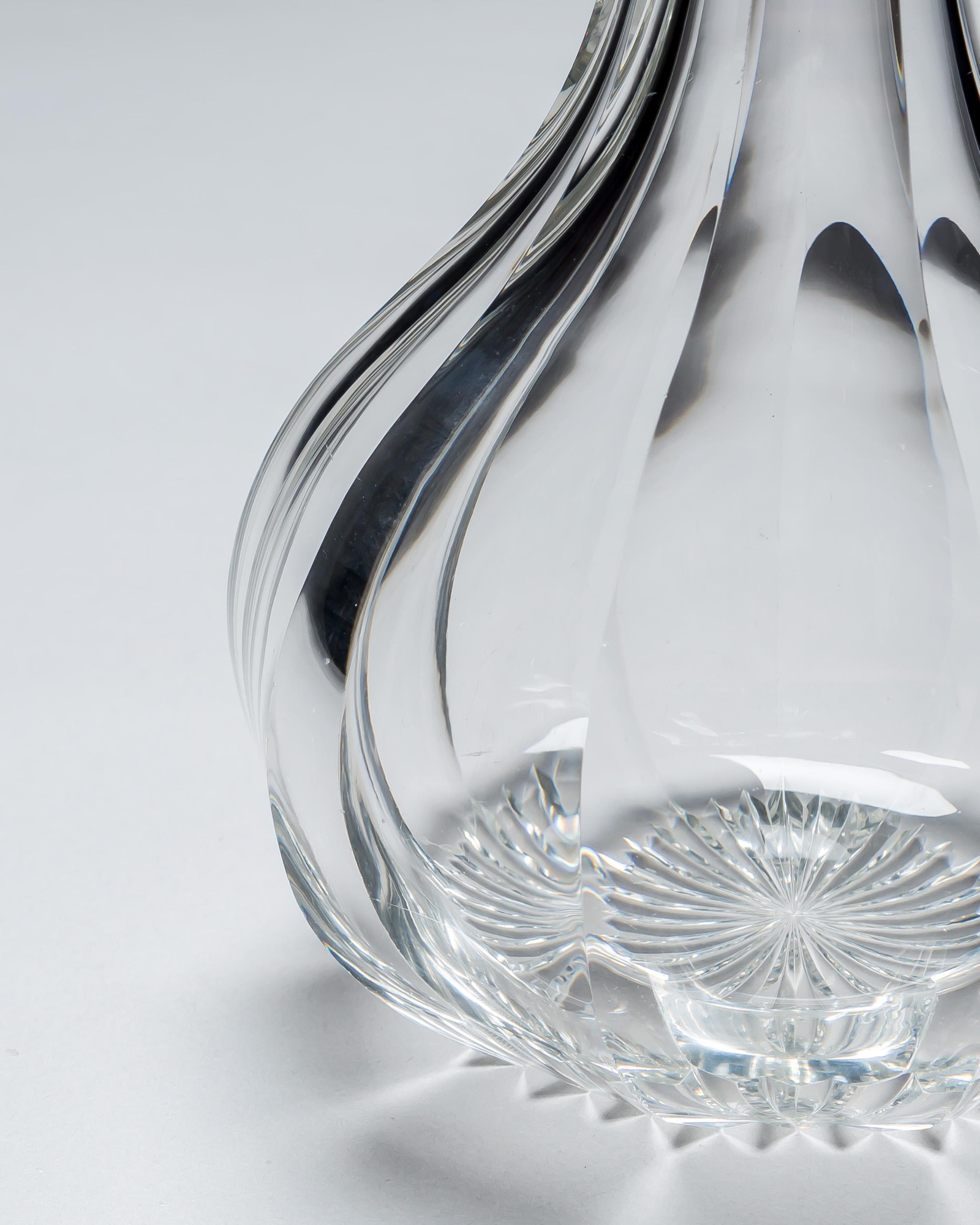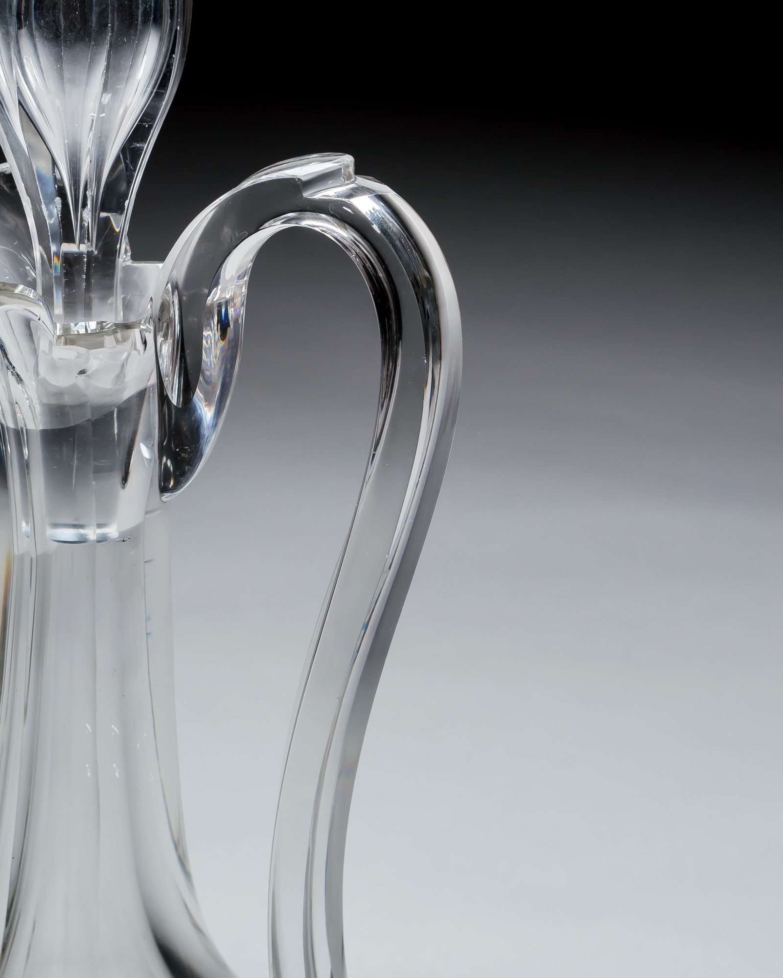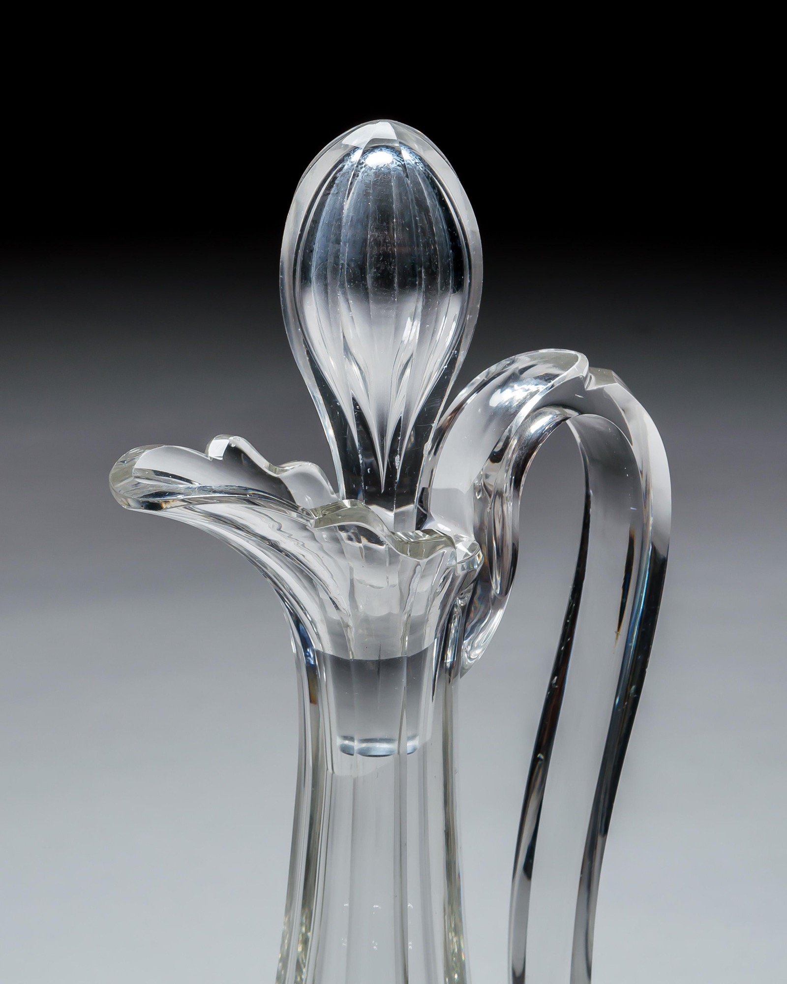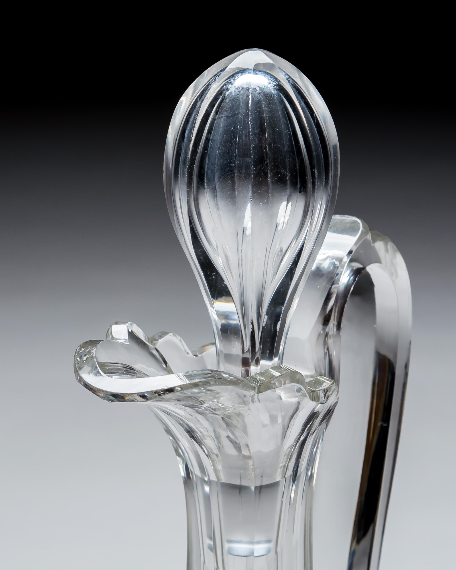 A beautifully proportioned Victorian cut glass claret jug of refined simplicity and fluid grace. The slender baluster form, slice cut body flows seamlessly from the fluted, star-cut base to the elegantly waisted neck, where a crisply scalloped rim opens like the petals of a flower. The finely applied loop handle, with its sweeping curve, balances the jug's vertical elegance with sculptural poise. The whole is crowned by a finely cut teardrop stopper that echoes the rhythm of the design below.