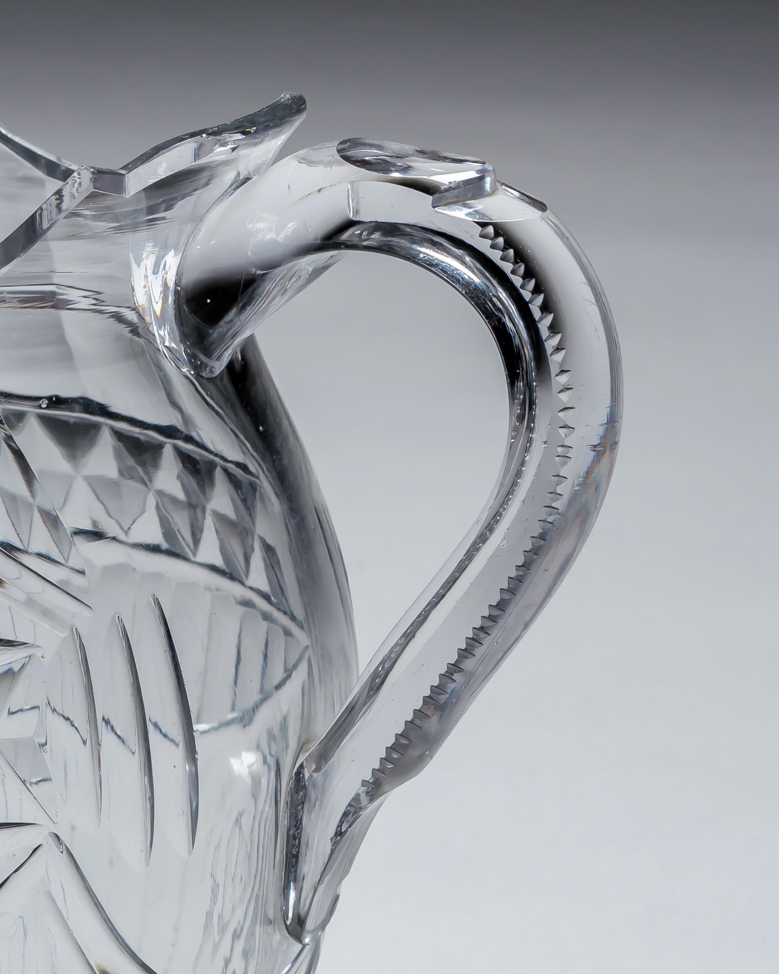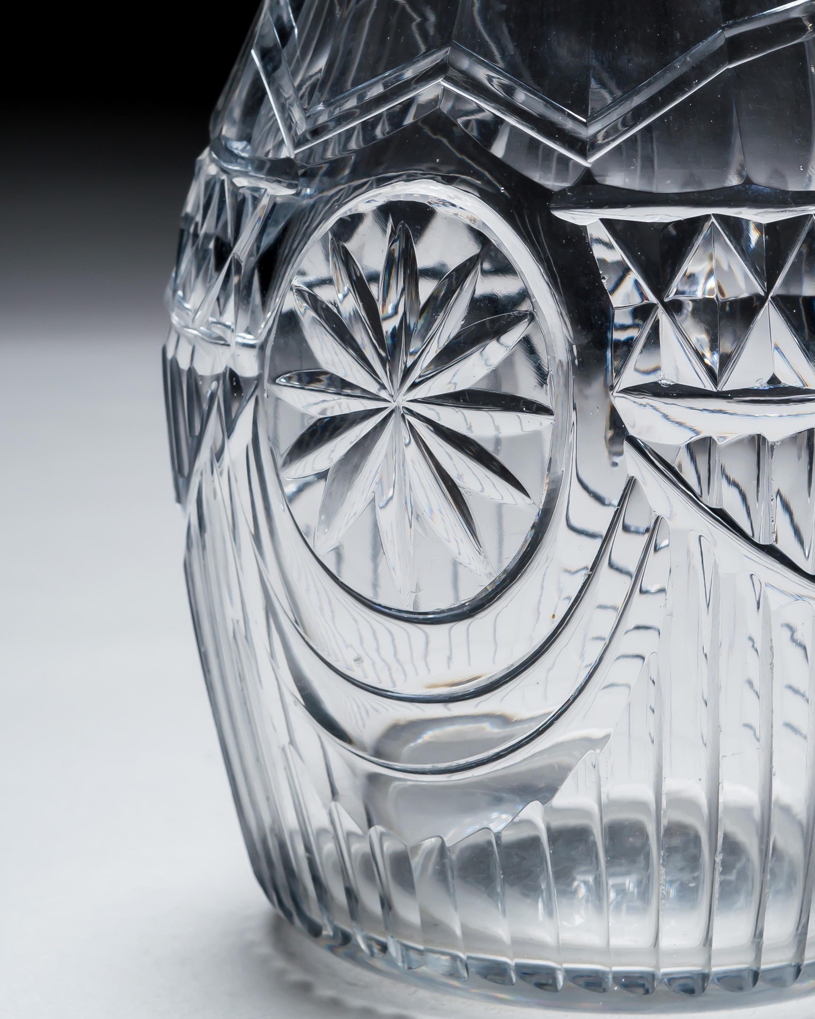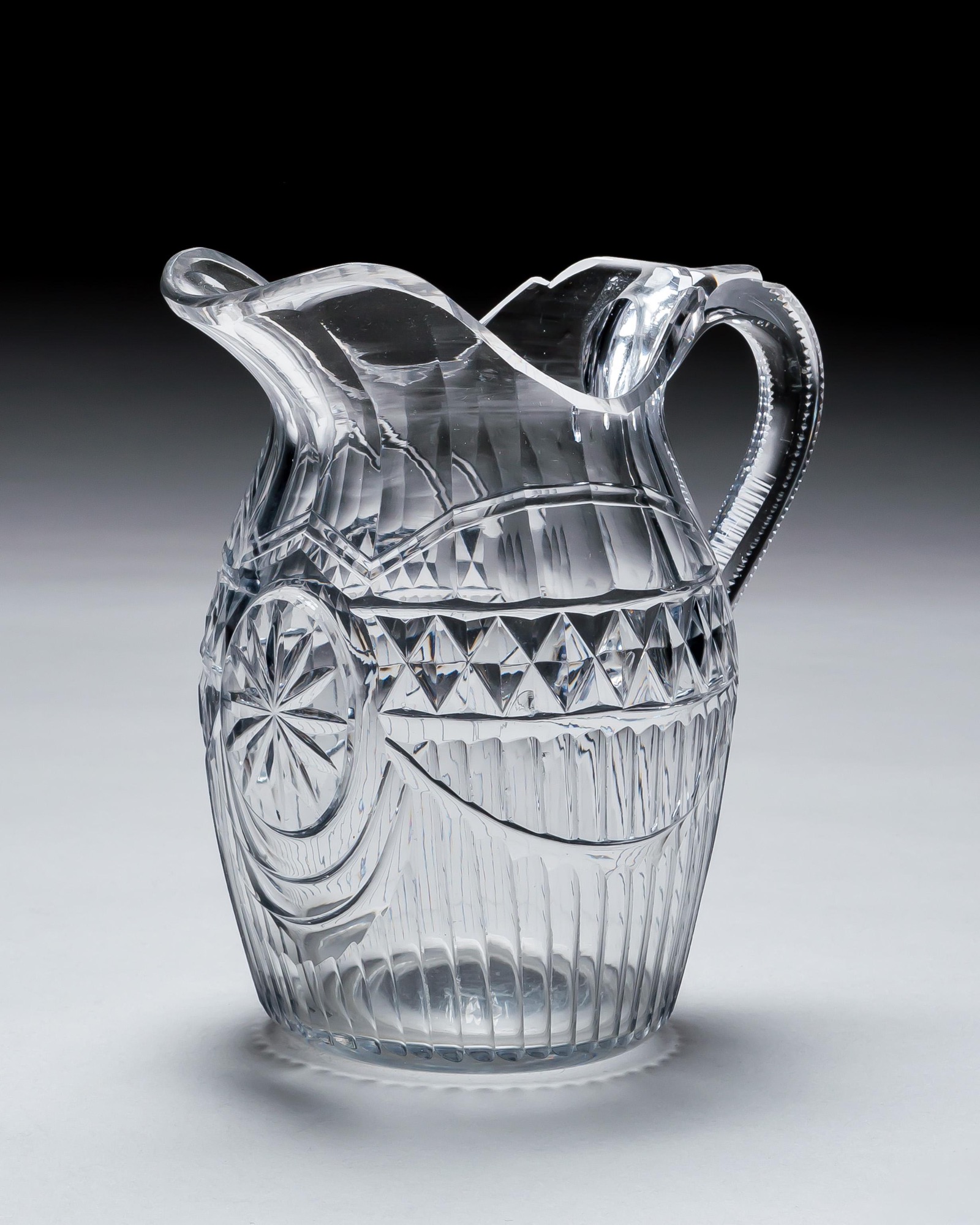 A magnificent Georgian period cut glass water jug of striking form and clarity, finely executed in the classic style of the early 19th century. The broad body is richly adorned with bold geometric cutting, including diamond facets, fluted panels, and a radiant star burst medallion that catches and scatters the light with dazzling precision.