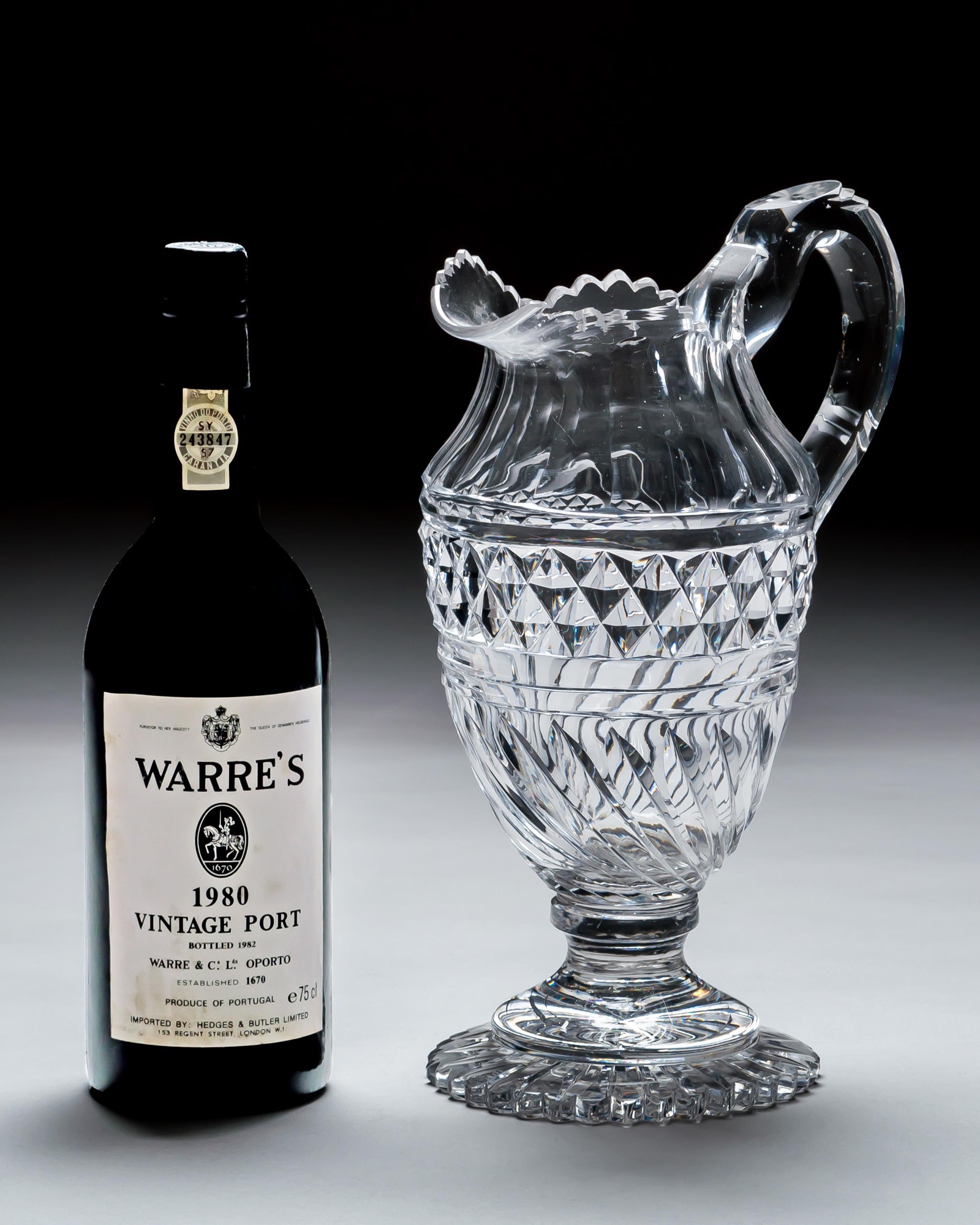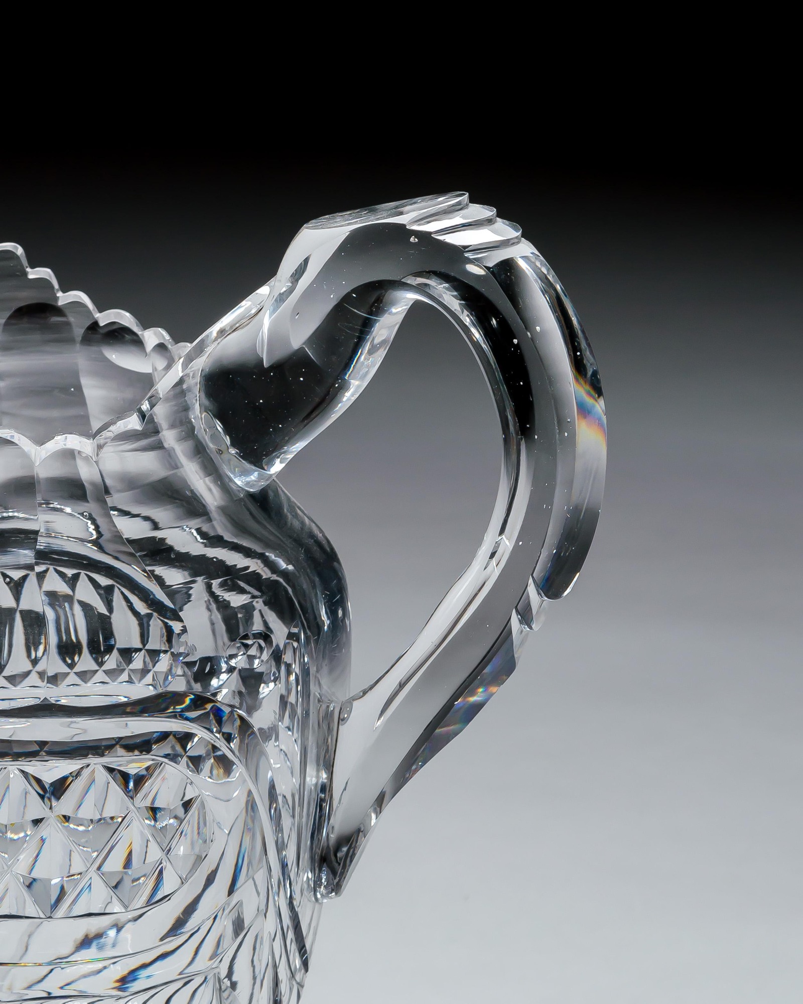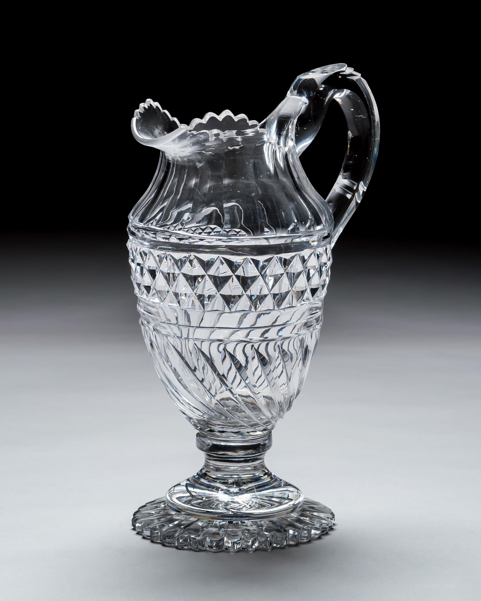 An exquisite early Regency period cut-glass jug of baluster form, standing elegantly upon a richly star-cut pedestal foot. The body is beautifully decorated with bold diamond cutting above fine spiral fluting, creating a dazzling interplay of light and texture. The neck features vertical flutes rising to a finely scalloped rim, while the applied handle completes the design with grace and balance.